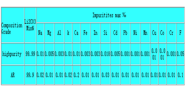 Formula:Li2CO3 Physical properties:White crystalline .slightly soluble in water. Standard of quality: